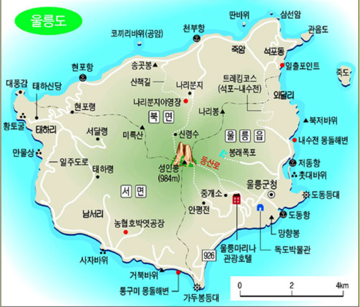 는 울릉도와 독도의 주요 관광지를 한눈에 보여줍니다.