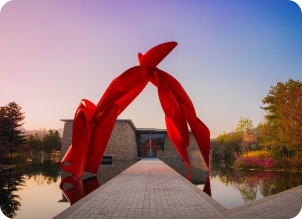 뮤지엄산은 아름다운 자연 경관으로 둘러싸여 있습니다. 특히 가을철에는 단풍이 물들어 더욱 아름다운 풍경을 자랑합니다. 뮤지엄산 주변에는 산과 호수가 있어, 산책이나 사진 촬영을 즐기기에 최적의 장소입니다.
