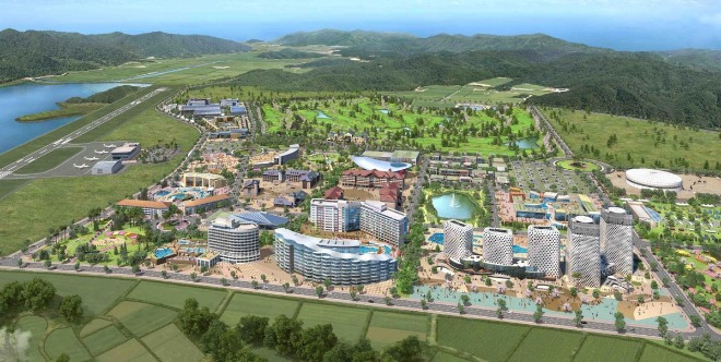 현대적인 리조트 단지가 푸른 자연 속에 자리 잡고 있는 모습입니다. 이곳은 관광과 여가를 위한 다양한 시설을 갖추고 있습니다.
