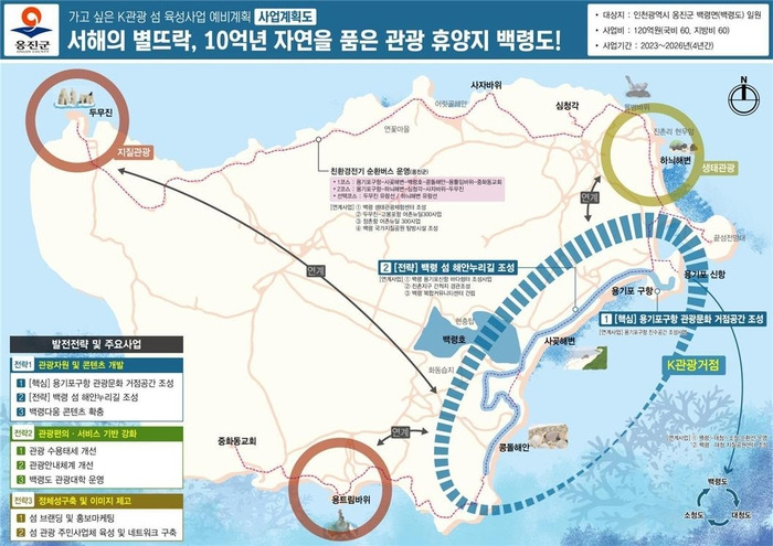 백령도의 관광명소와 개발 계획이 표시된 상세 지도입니다. 이 지도는 섬의 자연미와 레크리에이션 장소를 강조하고 있습니다.