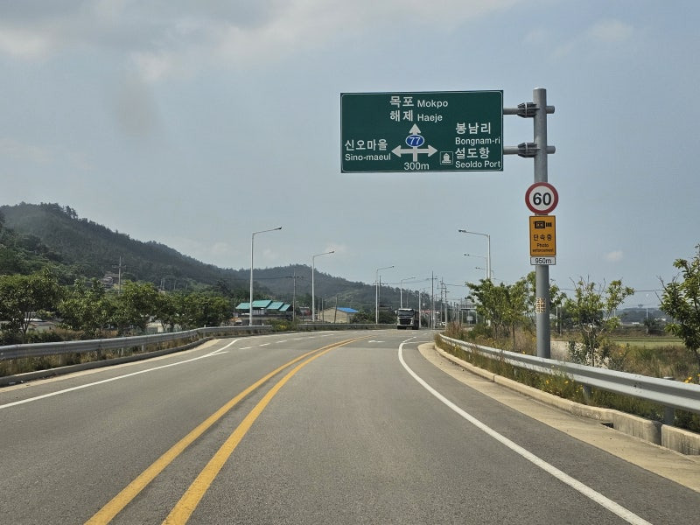 사진과 같은 도로 표지판을 쉽게 볼 수 있습니다. 이 표지판은 봉남리와 설도항으로 가는 방향을 안내해 줍니다.