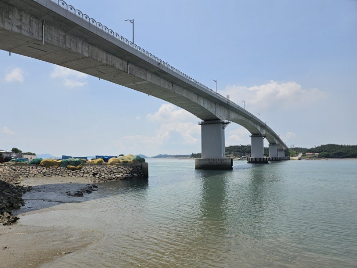 사진에서 보이는 다리를 건너면 증도로 쉽게 이동할 수 있습니다. 이곳에서는 다양한 해양 생물과 함께하는 체험 프로그램도 마련되어 있어 가족 단위 여행객들에게도 적합합니다.