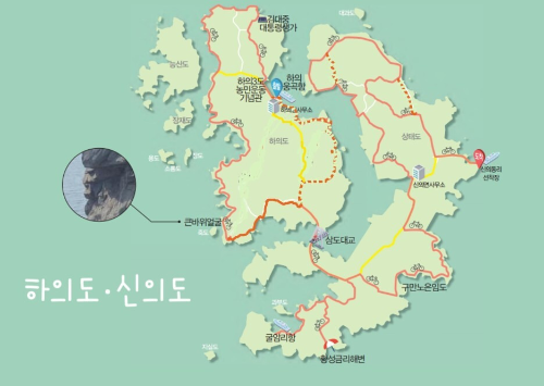 하의도에는 다양한 명소가 있습니다. 그 중에서도 '큰바위얼굴'은 하의도의 상징적인 장소로, 독특한 바위 형상이 많은 관광객들의 사진 촬영 명소로 알려져 있습니다. 또한, 황성금리 해수욕장은 맑은 물과 고운 모래사장으로 여름철에 많은 사람들이 찾는 인기 해변입니다. 이 외에도 하의도에는 자전거 도로가 잘 조성되어 있어, 자전거를 타고 섬을 한 바퀴 도는 것도 추천합니다.