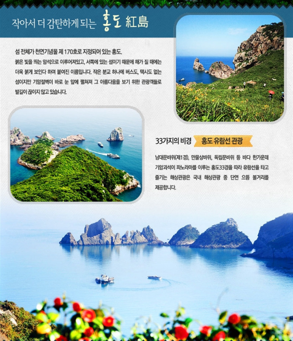 홍도는 대한민국의 170번째 국립공원으로 지정된 아름다운 섬입니다. 이곳은 푸른 바다와 울창한 숲, 그리고 독특한 바위 형성으로 유명합니다. 특히, 홍도의 해안선은 다양한 색깔의 바위와 절벽으로 이루어져 있어 사진 찍기 좋은 장소로 알려져 있습니다.