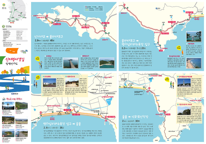 신지대교 휴게소에서 시작되는 명사갯길은 아름다운 해안선을 따라 걷는 코스입니다. 이 길은 석화포까지 이어지며, 걷는 동안 바다의 경치를 감상할 수 있습니다. 특히, 해안가의 다양한 생물들을 관찰할 수 있어 자연을 사랑하는 분들에게 추천합니다.